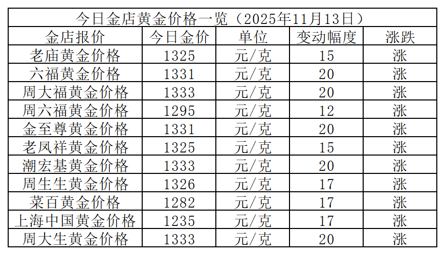 11月13日金价速报,国内品牌金店金价再创新高,整体涨幅保持在17元/克。周大生黄金今日大涨20元/克,报1333元/克,与潮宏基、周大福继续并列最高价金店;上海中国黄金大涨17元/克,报价1235元/克,仍是最低价金店。金店金价高低价差扩大中,报98元/克。