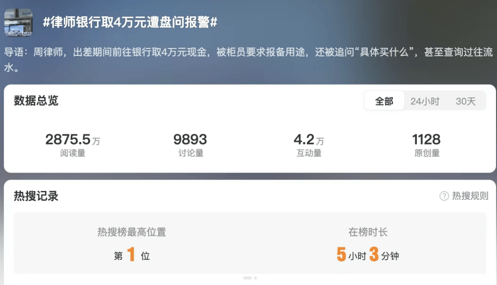 近日,一律师反映在银行取款4万元被柜员盘问并报警,引发广泛关注,相关话题登上微博热搜。