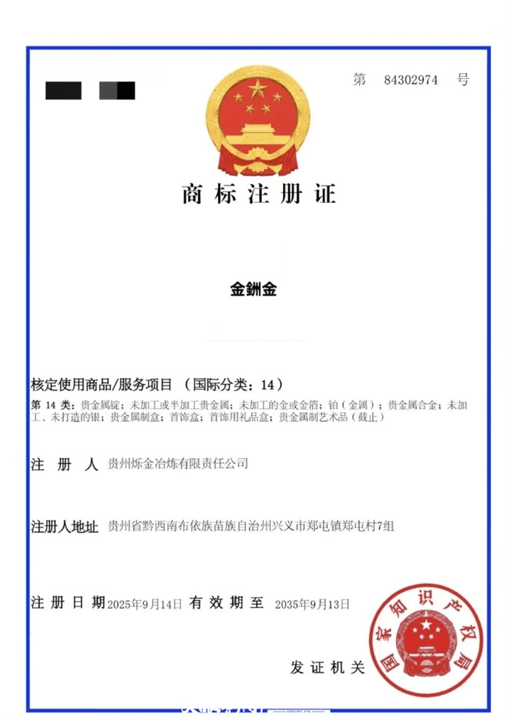 作为黔西南州目前生产能力最大的黄金精加工企业,贵州烁金冶炼有限责任公司不仅拥有年产15吨以上的黄金精炼生产线,1000吨白银提纯生产线也即将落地。该公司的核心品牌标识“金銂金”商标日前已正式通过国家知识产权局审核成功注册。
