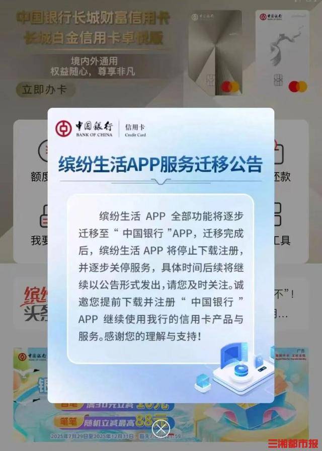 国有大行带头“砍”。中国工商银行早在2021年就陆续终止多个冗余App,用户还可通过微信公众号这一统一入口跳转App办理多项业务。9月28日,中国银行信用卡官方公众号发布了关于“缤纷生活”服务迁移的公告,宣布将其全部功能逐步迁移至“中国银行”App,停止下载注册,并逐步关停服务,这也是首家关停独立信用卡App的国有大行。