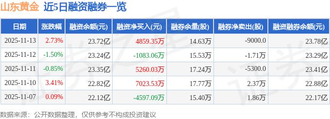 山东黄金融资融券信息显示,融资方面,当日融资买入2.17亿元,融资偿还1.69亿元,融资净买入4859.35万元。融券方面,融券卖出5700.0股,融券偿还1.47万股,融券余量14.63万股,融券余额534.33万元。融资融券余额23.78亿元。
