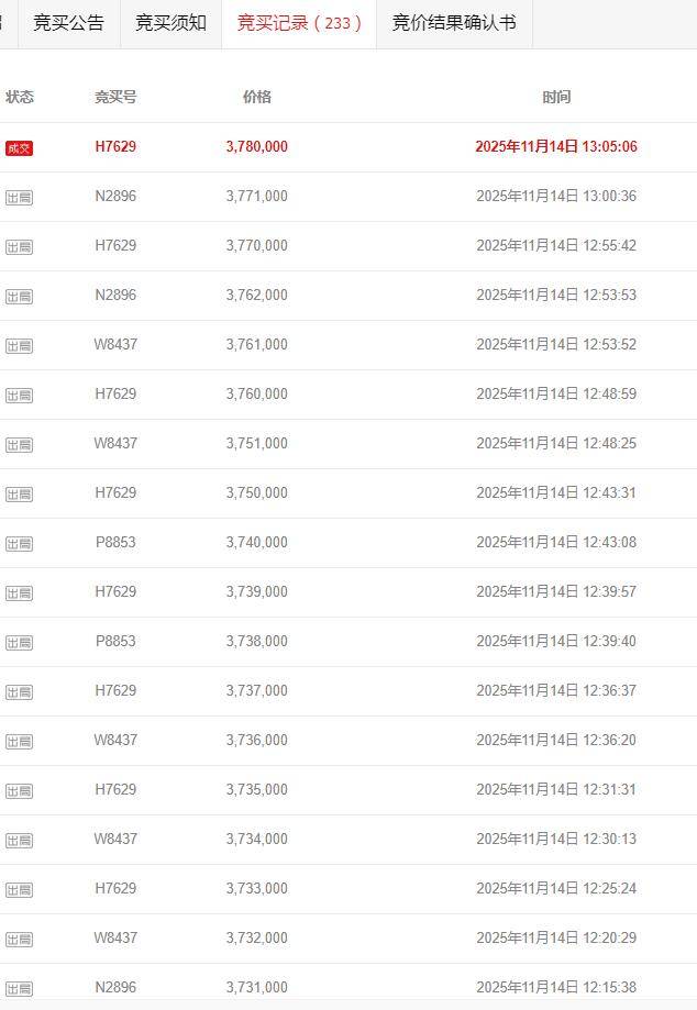 10月13日上午10时,竞拍一开始,就有竞拍者果断出价,竞拍也就拉开了大幕,随后,陆续有买家出价。最为激烈的竞拍是从14日上午9时开始的,此时,虽然还没到截止时间,但竞拍者们的竞拍已经擦出了火花。