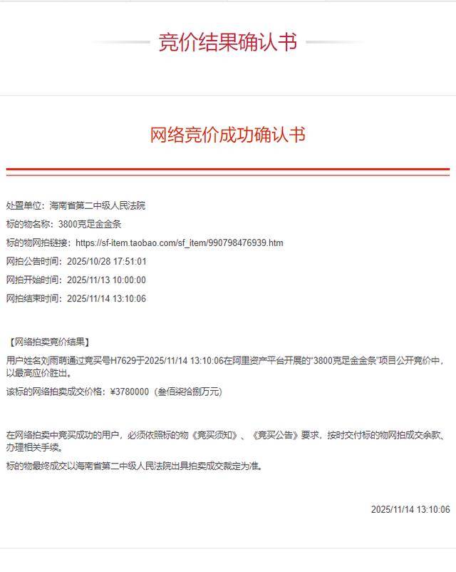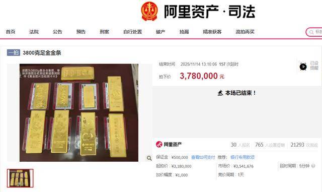 11月14日,法拍市场上备受关注的一宗3800克的法拍黄金终于尘埃落定。此次竞拍有超过2.1万人围观,765人设置提醒。30名竞拍者上头‘疯狂’竞拍233轮,最终成交价格达到378万元,成交单价接近995元每克,超过当日银行金条价格20多元。