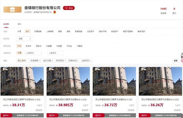 除了阿里拍卖APP外,在京东资产交易平台上,也有部分房产信息上有“银行直供”标签。比如,盘锦银行在京东资产交易平台上共挂出过1445件标的物,其中大部分为房产。