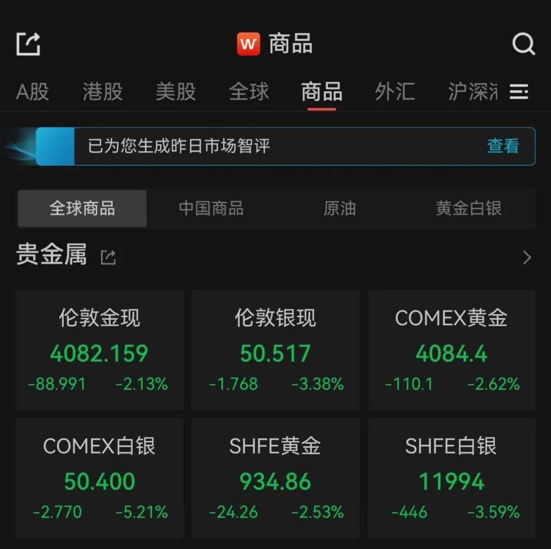 11月14日晚间,金价突然大跳水,现货黄金价格一度大跌3.21%。截至11月15日7时10分,跌幅收窄至2.13%,报4082.159美元/盎司;期货黄金跌幅为2.62%,报4084.4美元/盎司。
