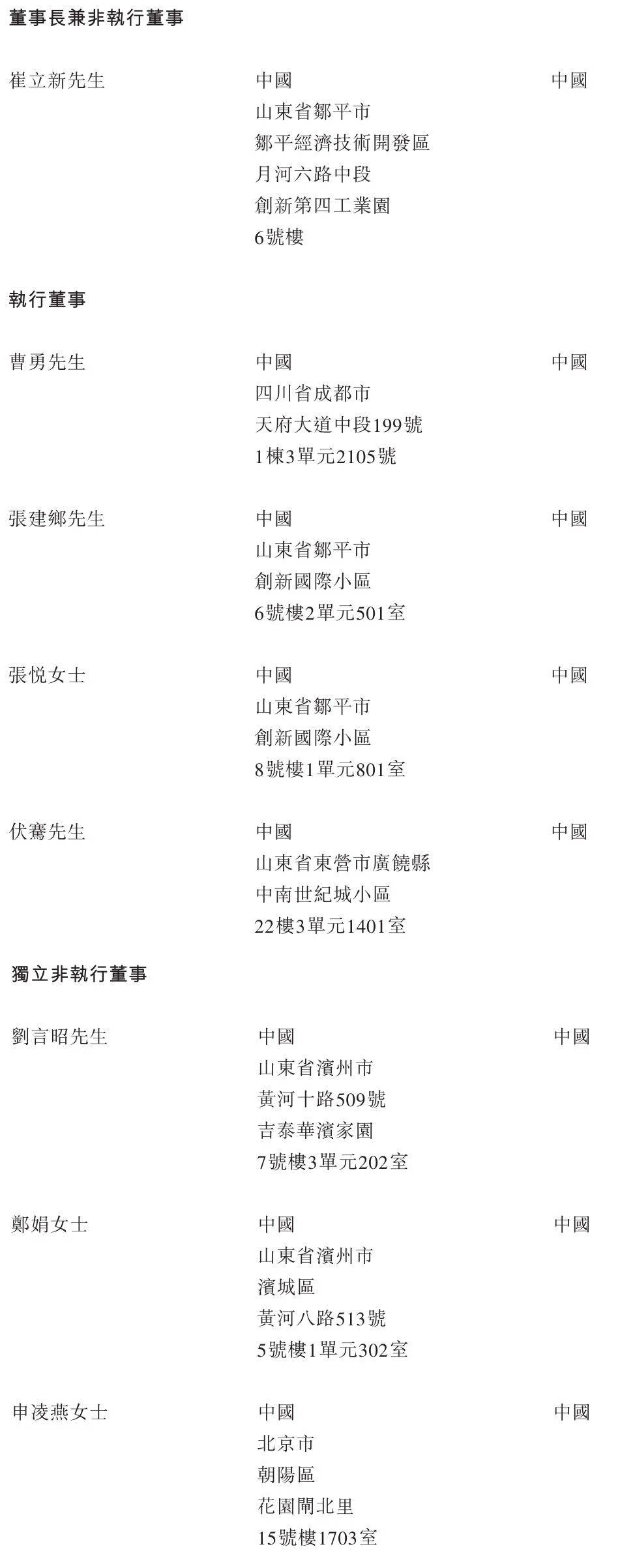 创新国际董事长兼非执行董事为崔立新,执行董事分别为曹勇、张建乡、张悦女士、伏骞;独立非执行董事分别为刘言昭、郑娟女士、申凌燕女士。