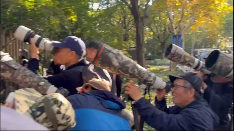 近年来,但凡有罕见的鸟类出现,都能吸引大批观鸟和摄影爱好者,如果它又是颜值在线的鸟,前来拍摄的人群会更多。比如,曾经出现在长风公园的仙八色鸫、出现在世博文化公园的绿翅鸠。摄影爱好者们的装备也越来越精良,爷叔们扛着数万元的长枪短炮,为了拍到最佳画面,常常在公园一泡就是一天,很有耐心。