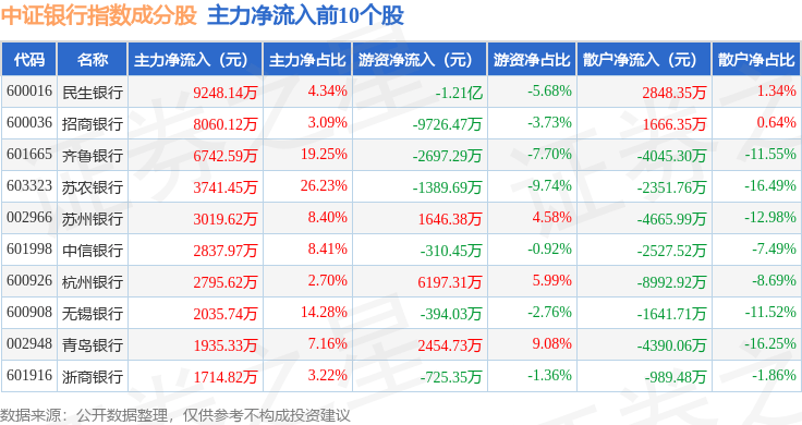 资金流向方面,中证银行(399986)指数成份股当日主力资金净流出合计8.31亿元,游资资金净流入合计6.44亿元,散户资金净流入合计1.87亿元。成份股资金流向详情见下表: