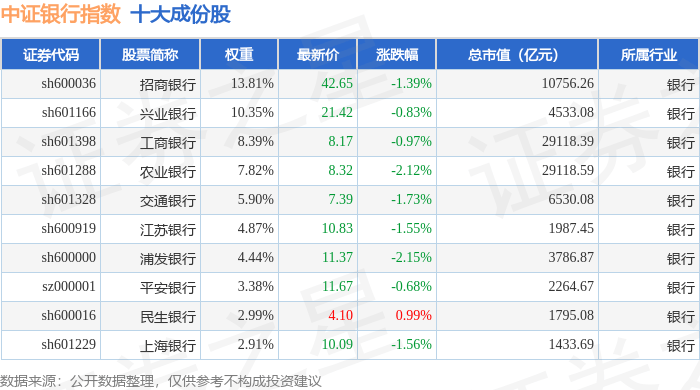 证券之星消息,11月17日,中证银行(399986)指数报收于7766.26点,跌1.32%,成交318.85亿元,换手率0.32%。当日该指数成份股中,上涨的有2家,民生银行以0.99%的涨幅领涨,下跌的有40家,江阴银行以2.79%的跌幅领跌。