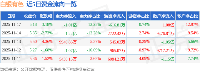 证券之星消息,截至2025年11月17日收盘,白银有色(601212)报收于5.18元,下跌3.18%,换手率2.16%,成交量160.0万手,成交额8.3亿元。