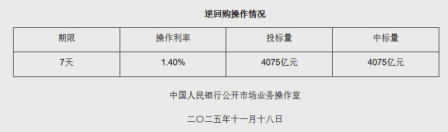 中新网11月18日电 据央行网站消息,2025年11月18日中国人民银行以固定利率、数量招标方式开展了4075亿元7天期逆回购操作。具体情况如下: