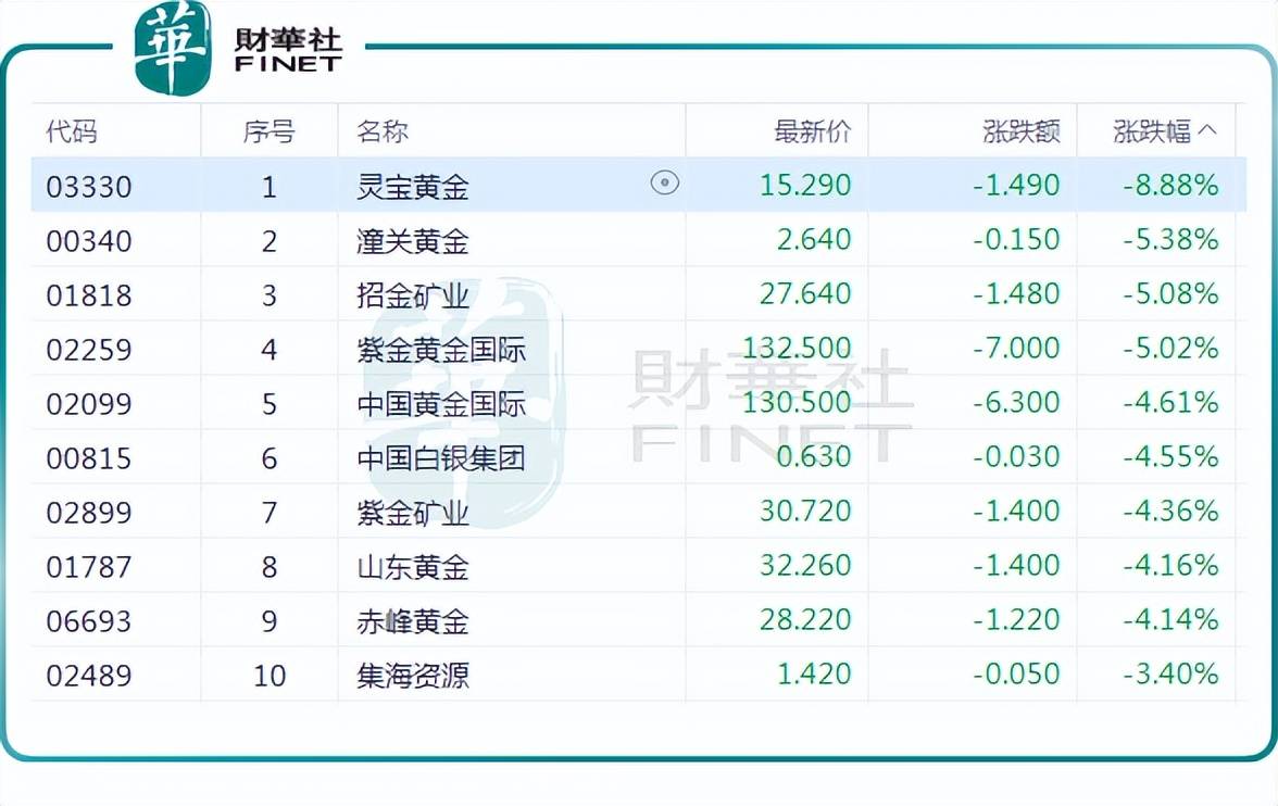 A股中,截至收盘,中金黄金(600489.SH)跌3.51%,招金黄金(000506.SZ)跌3.34%,湖南黄金(002155.SZ)跌3.1%,西部黄金(601069.SH)跌2.88%,赤峰黄金(600988.SH)跌2.2%,山东黄金(600547.SH)等亦纷纷下行。