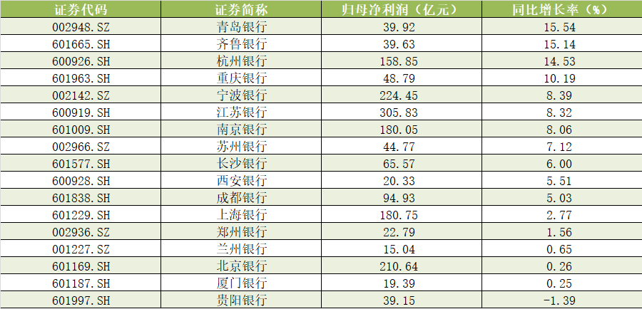 具体看,青岛银行、齐鲁银行、杭州银行净利增速居前,分别为15.54%、15.14%、14.53%。贵阳银行净利增速出现负增长,为-1.39%。