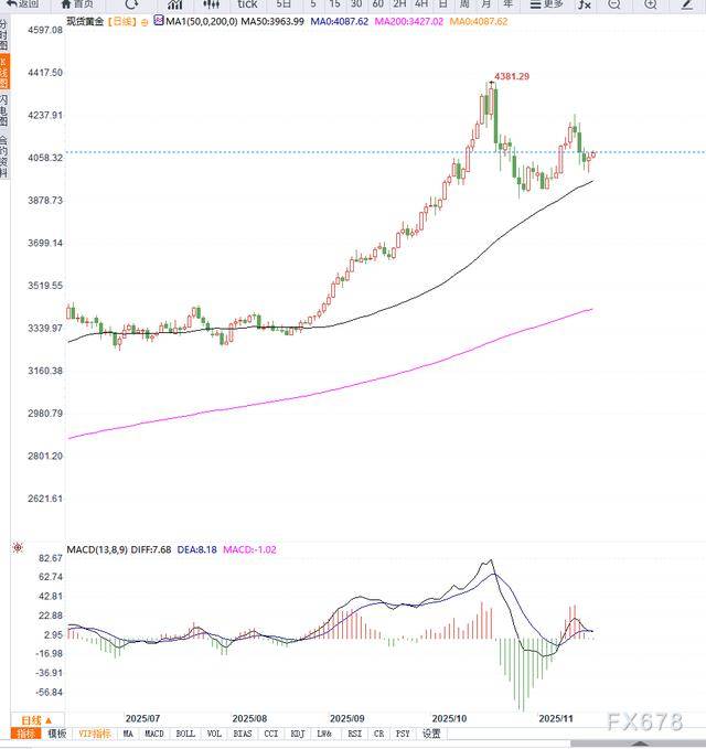 从日线图观察,黄金在靠近4,000美元整数位附近获得显著支撑,短期呈现弱势反弹结构。价格目前位于20日均线上方,但整体仍受压于4,100美元的强阻力区。
