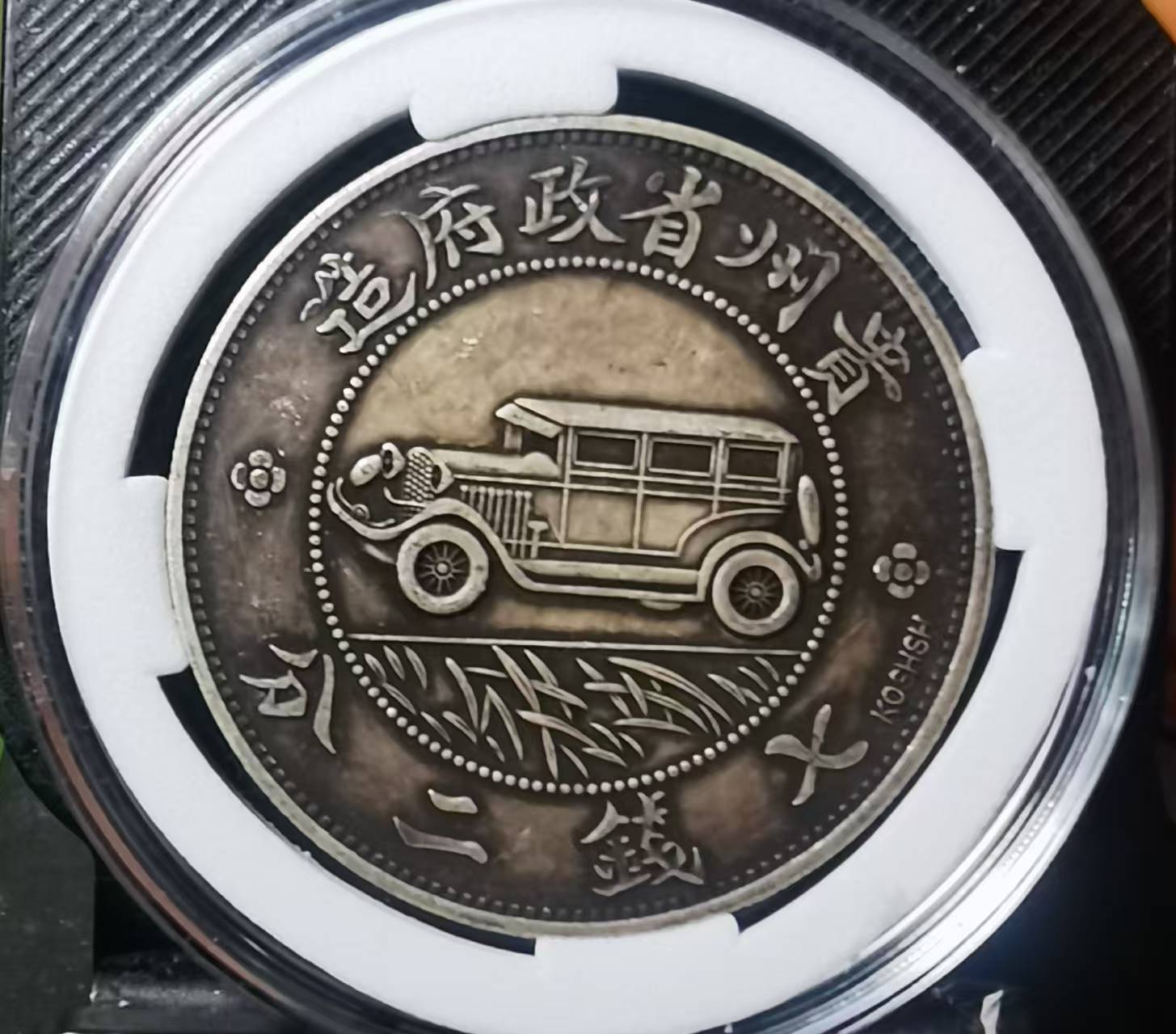 - **汽车形象**:币面中央的汽车造型写实,细节丰富——车头的格栅、车轮的辐条、车身的窗户都清晰可辨,展现了当时铸币工艺的精湛水准。这辆汽车原型是周西成从香港购入的美国福特牌汽车,它的出现打破了贵州“地无三里平”的交通困局,成为贵州近代交通史的开端。