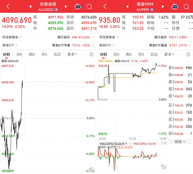 同花顺数据显示,截至北京时间11月19日13点30分,伦敦现货黄金价报4090.69美元/盎司,日涨幅约0.35%;上海黄金交易所现货黄金(Au99.99)价报935.8元/克,日涨幅约2%。