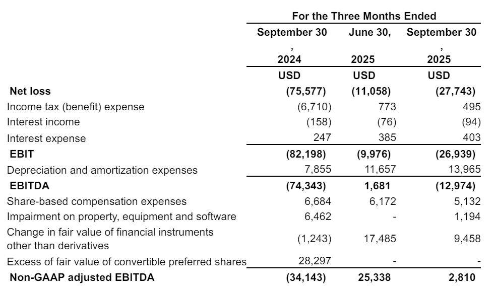 嘉楠科技2025年第三季度EBIT为-2694万美元,EBITDA为-1297万美元,Non-GAAPadjustedEBITDA为281万美元。