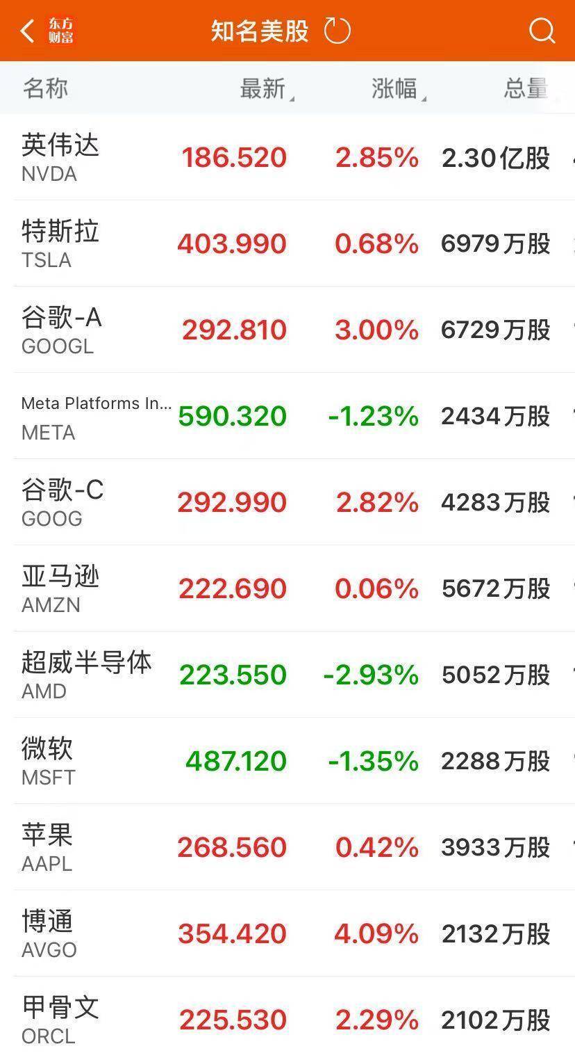 大型科技股多数上涨,英伟达涨2.85%,微软跌1.35%,苹果涨0.42%,亚马逊涨0.06%,Meta跌1.23%,特斯拉涨0.70%,博通涨4.09%,甲骨文涨2.29%。