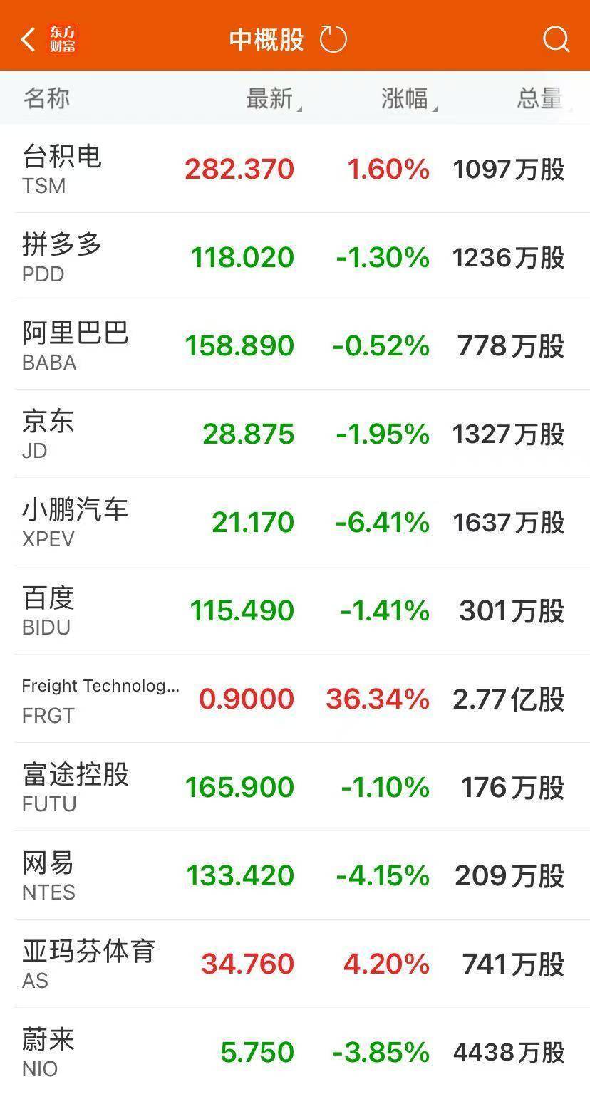 热门中概股多数下跌,纳斯达克中国金龙指数跌1.54%,阿里巴巴跌0.52%,京东跌1.95%,拼多多跌1.30%,蔚来汽车跌3.85%,小鹏汽车跌6.41%,理想汽车跌3.27%,哔哩哔哩跌3.43%,百度跌1.43%,网易跌4.15%,腾讯音乐涨0.16%,小马智行跌4.17%。