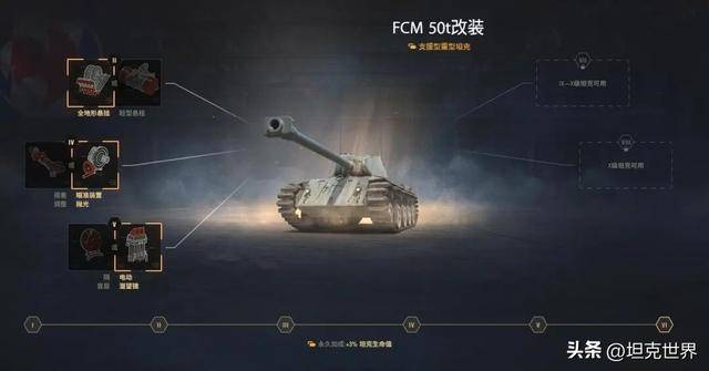 FCM 50t属于“支援型重型坦克”。该车在战地改装达到满级后,可以获得额外的3%坦克生命值,还可以增加多项性能升级与1项配件加成栏位选择。性能改装玩家可以选择全地形悬挂、瞄准装置抛光、电动潜望镜以加强坦克战斗力,具体选择按照玩家战斗风格微调。
