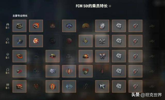 在坦克技能方面,可以依照上图所示选择。重型坦克的基础技能就是修理、兄弟连、紧急应对、熟能生巧、短兵相接等技能,除此之外也可以在快速转弯、完美装药等技能上进行选择。FCM 50t对机动性有较强的需求,因此非常建议优先学习如履平地、机械达人等增强机动性的技能。