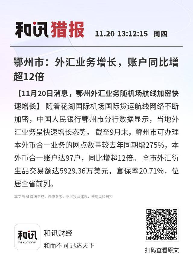 【11月20日消息,鄂州外汇业务随机场航线加密快速增长】随着花湖国际机场国际货运航线网络不断加密,中国人民银行鄂州市分行数据显示,当地外汇业务呈快速增长态势。截至9月末,鄂州市可办理本外币合一业务的网点数量较去年同期增275%,本外币合一账户达97户,同比增超12倍。全市外汇衍生品交易额达5929.36万美元,套保率20.71%,位居全省前列。