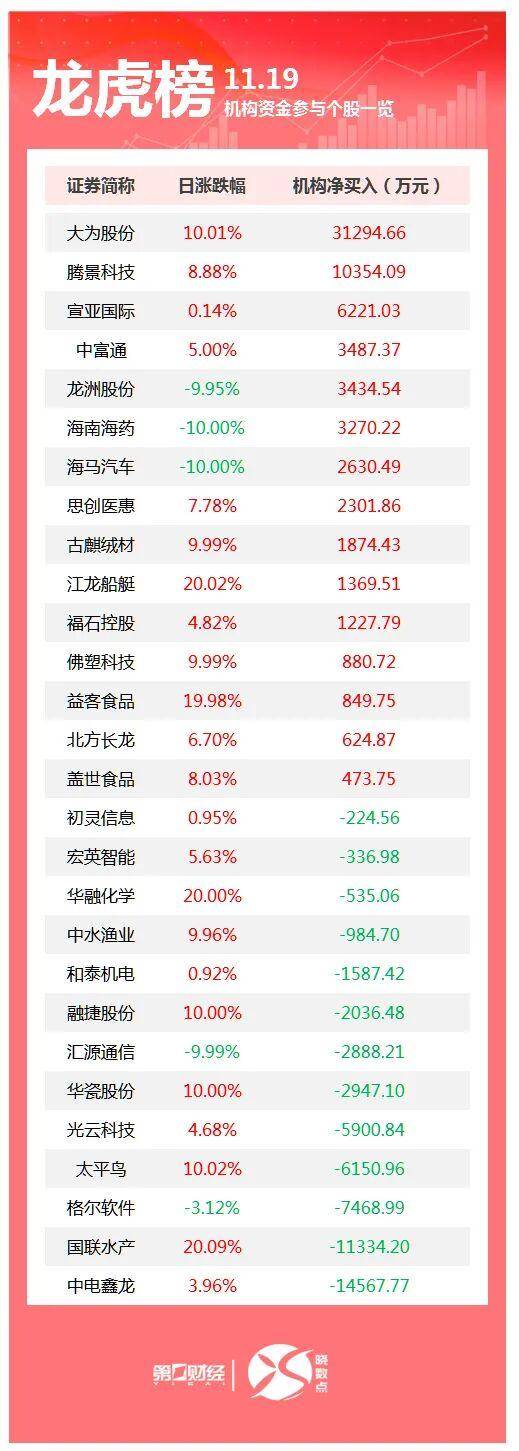 11月19日龙虎榜中,共28只个股出现了机构的身影,有15只股票呈现机构净买入,13只股票呈现机构净卖出。当天机构净买入前三的股票分别是大为股份、腾景科技、宣亚国际;当天机构净卖出前三的股票分别是中电鑫龙、国联水产、格尔软件。