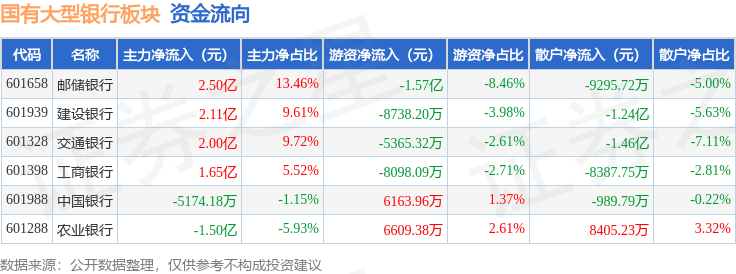 从资金流向上来看,当日国有大型银行板块主力资金净流入6.24亿元,游资资金净流出2.51亿元,散户资金净流出3.72亿元。国有大型银行板块个股资金流向见下表:
