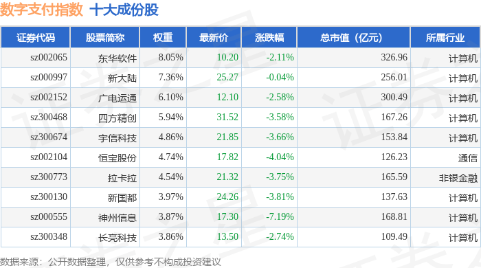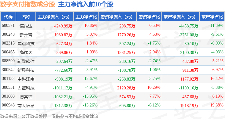 资金流向方面,数字支付(980113)指数成份股当日主力资金净流出合计29.52亿元,游资资金净流入合计5.04亿元,散户资金净流入合计24.13亿元。成份股资金流向详情见下表: