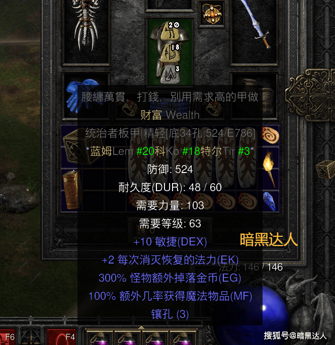 衣服:符文之语“财富”,力量需求较低的三孔灰色品质衣服作为底材,符文顺序为20号(蓝姆Lem)+18号(科Ko)+3号(特尔Tir)