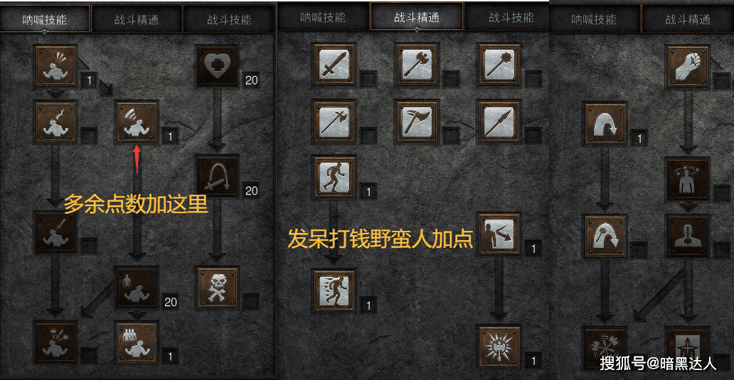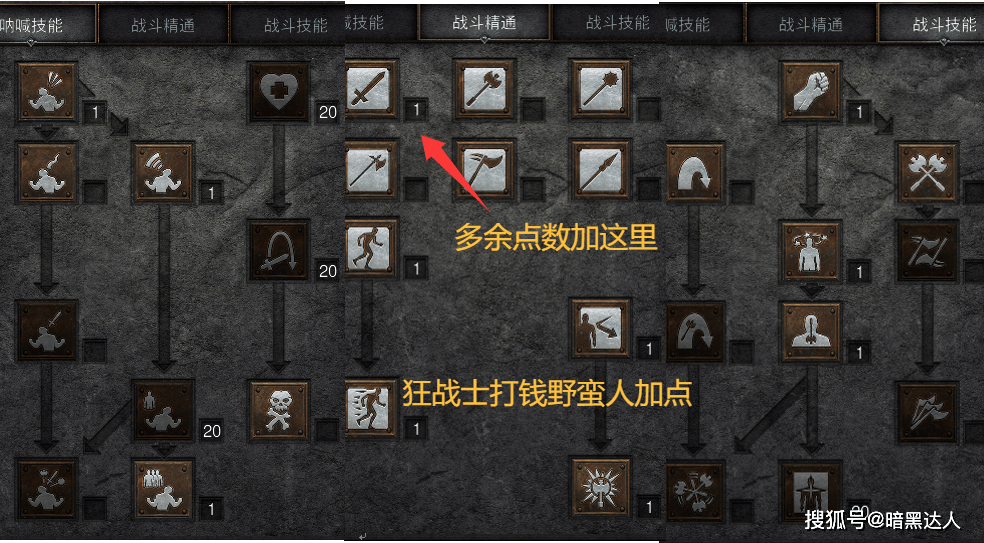 战斗技能:猛击1点 、击晕1点、专注1点、狂战士20点