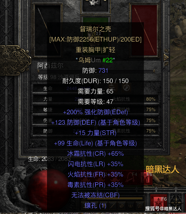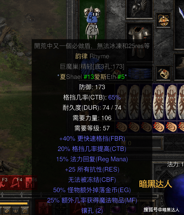 盾牌:符文之语“韵律”,底材选择2孔灰色盾牌,符文顺序13号(夏Shael)+5号(艾斯Eth),或暗金盾牌“暴风之盾”(任务打孔镶个32号符文,无法被冰冻)。
