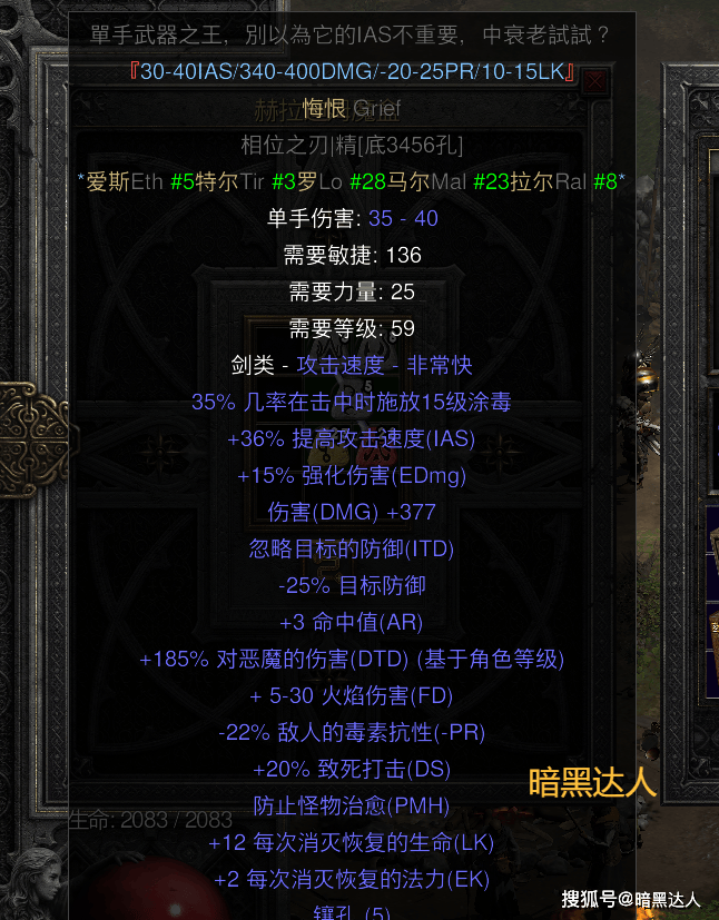 武器:符文之语“悔恨” ,考虑到成本建议与圣骑士共用一把,底材选择5孔灰色品质“相位之刃”(省去修理烦恼),符文顺序5号(艾斯Eth)+3号(特尔Tir)+28号(罗Lo)+23号(马尔Mal)+8号(拉尔Ral)