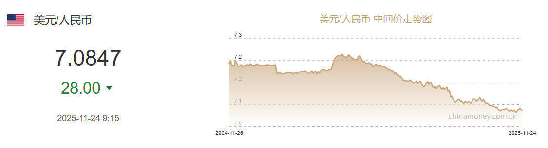 中新网11月24日电 据中国外汇交易中心网站消息,中国人民银行授权中国外汇交易中心公布,2025年11月24日银行间外汇市场人民币汇率中间价为:1美元对人民币7.0847元,上调28个基点。