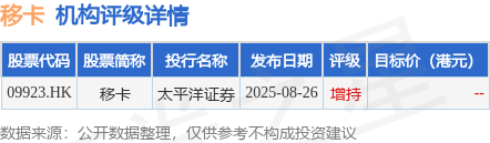 投行对该股的评级以增持为主,近90天内共有1家投行给出增持评级。太平洋证券最新一份研报给予移卡增持评级。