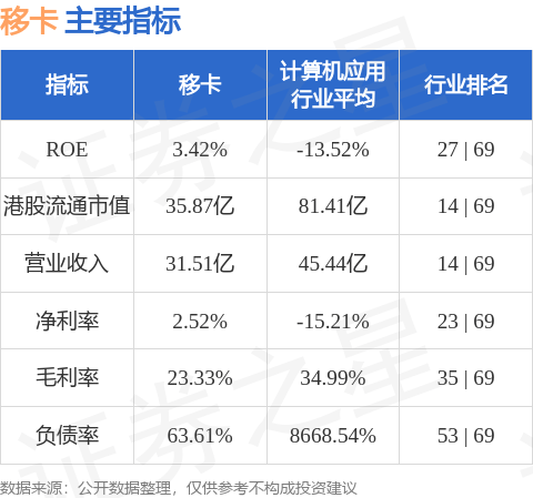 移卡港股市值35.87亿港元,在计算机应用行业中排名第14。主要指标见下表: