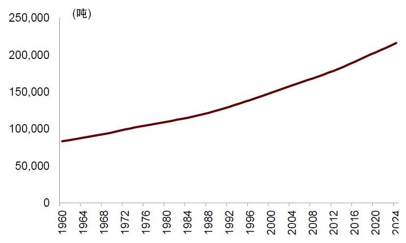 黄金产量增长稳定,价格主要取决于需求。根据世界黄金协会的数据,2024年地上黄金总量为21.6万吨。根据美国地质调查局以及Our World in Data的黄金产量数据,可以推断1960-2024年黄金总量的年复合增长率为1.5%,近几年黄金每年的产量约为3000吨左右,基本保持稳定。
