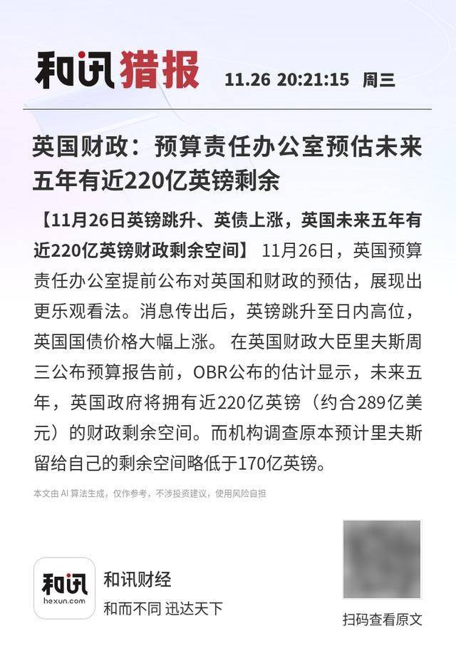 【11月26日英镑跳升、英债上涨,英国未来五年有近220亿英镑财政剩余空间】11月26日,英国预算责任办公室提前公布对英国和财政的预估,展现出更乐观看法。消息传出后,英镑跳升至日内高位,英国国债价格大幅上涨。 在英国财政大臣里夫斯周三公布预算报告前,OBR公布的估计显示,未来五年,英国政府将拥有近220亿英镑(约合289亿美元)的财政剩余空间。而机构调查原本预计里夫斯留给自己的剩余空间略低于170亿英镑。