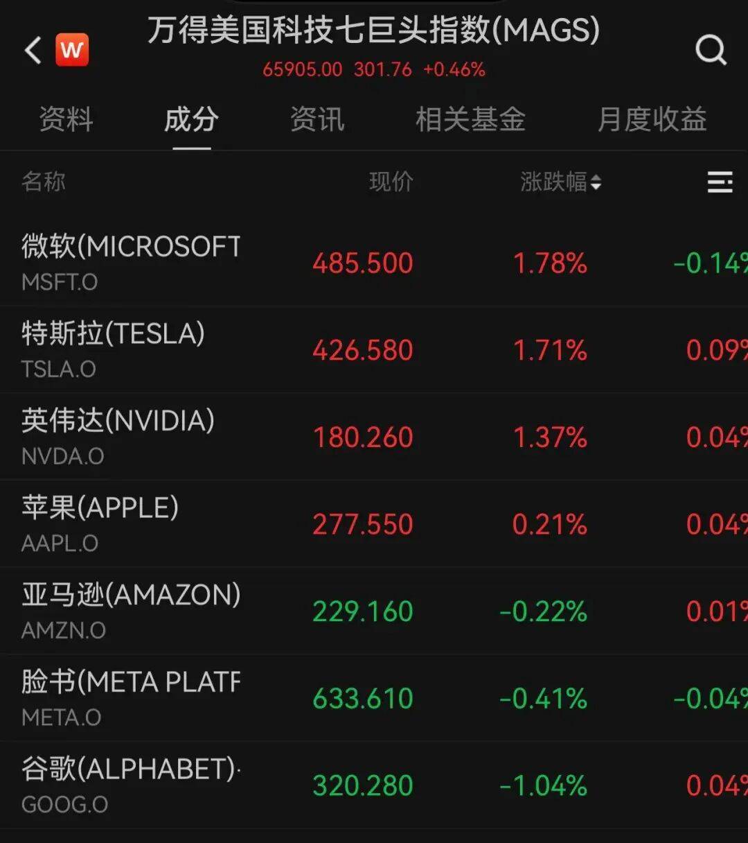 美股大型科技股走势分化,万得美国科技七巨头指数涨0.46%。其中,微软、特斯拉涨超1.7%,英伟达涨1.37%,谷歌跌超1%。