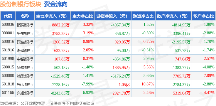 从资金流向上来看,当日股份制银行板块主力资金净流出3360.95万元,游资资金净流入4702.0万元,散户资金净流出1341.06万元。股份制银行板块个股资金流向见下表:
