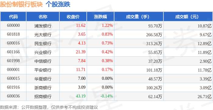 证券之星消息,11月27日股份制银行板块较上一交易日上涨0.34%,浦发银行领涨。当日上证指数报收于3875.26,上涨0.29%。深证成指报收于12875.19,下跌0.25%。股份制银行板块个股涨跌见下表:
