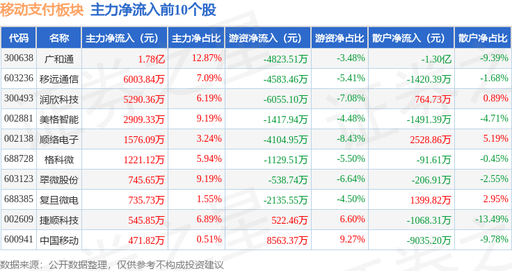 从资金流向上来看,当日移动支付板块主力资金净流出8.8亿元,游资资金净流出9729.37万元,散户资金净流入9.78亿元。移动支付板块个股资金流向见下表:
