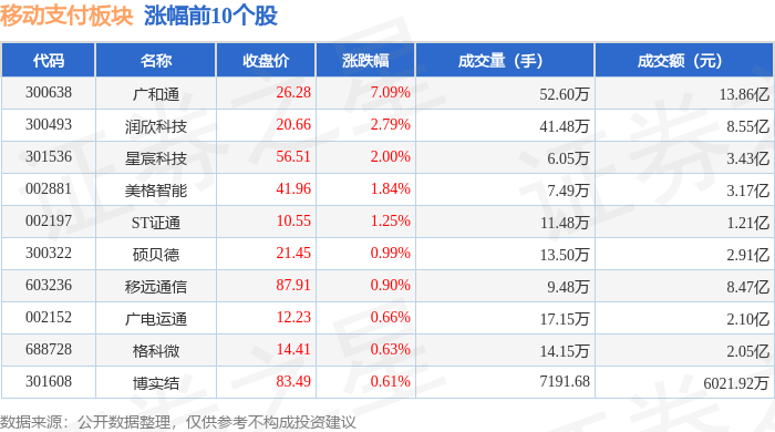 证券之星消息,11月27日移动支付板块较上一交易日下跌0.72%,石基信息领跌。当日上证指数报收于3875.26,上涨0.29%。深证成指报收于12875.19,下跌0.25%。移动支付板块个股涨跌见下表:
