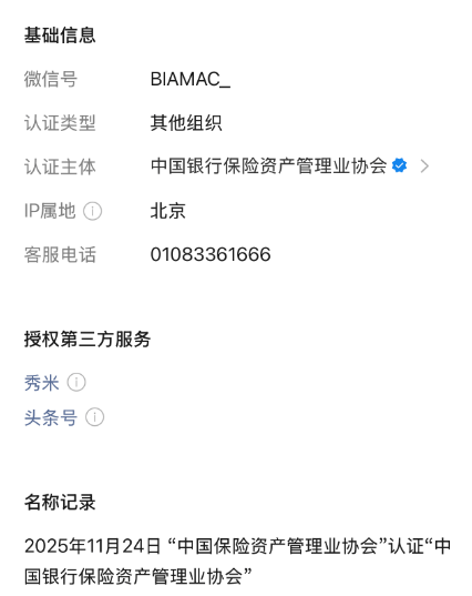 其中,“名称记录”显示,2025年11月24日“中国保险资产管理业协会”认证“中国银行保险资产管理业协会”。
