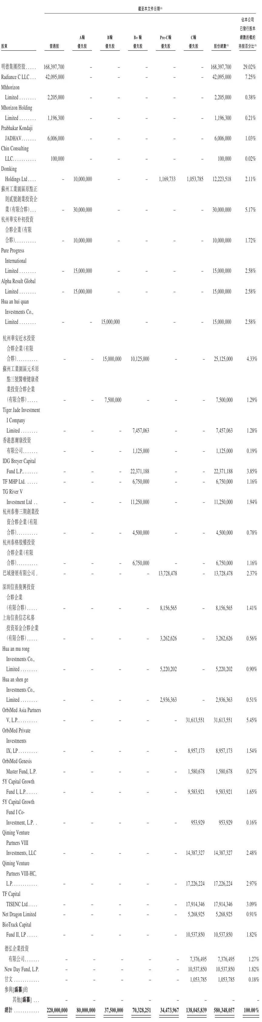 深圳信熹复兴投资合伙企业(有限合伙)持股为1.41%,上海信熹信芯私募投资基金合伙企业(有限合伙)持股为0.56%,Hua an mu rong Investments持股为0.9%,Hua an shen ge持股为0.51%,OrbiMed Asia Partners持股为5.45%,OrbiMed Private Investments持股为1.54%,5Y Capital Growth持股为1.65%;
