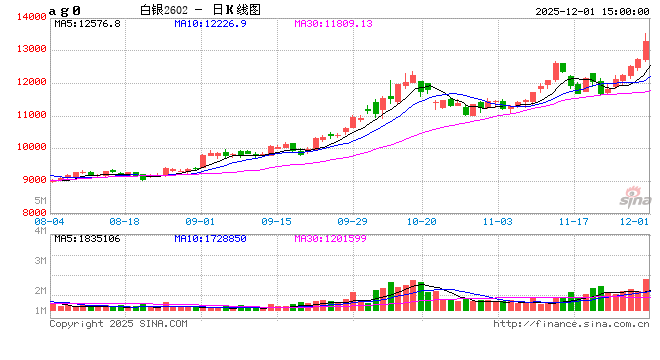 2025年12月1日,国内主力合约涨多跌少,沪银涨近6%,铂涨近4%,多晶硅、集运欧线涨超3%,、国际、、钯、沪铜涨超2%。跌幅方面,鸡蛋跌超2%,玻璃、菜粕、氧化、跌超1%。