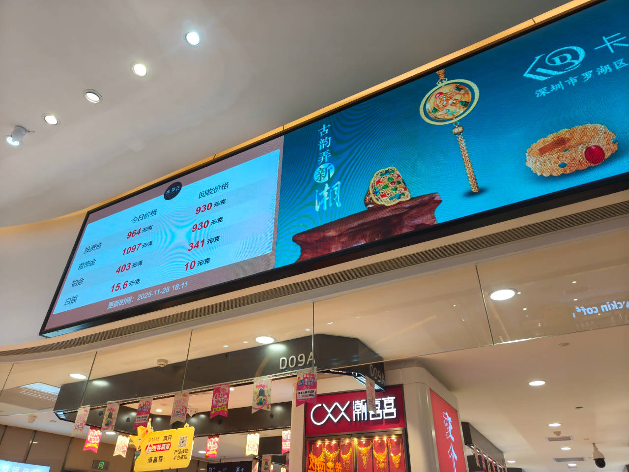 记者注意到,目前在水贝市场的各个大楼里几乎都有大屏幕显示当日价格,区分投资金和首饰金,显示的都是含税价,后者价格比前者价格高出近14%。并且,这个价格会根据国际大盘实时调整。有时候手头的计算还没完成,价格又变了。