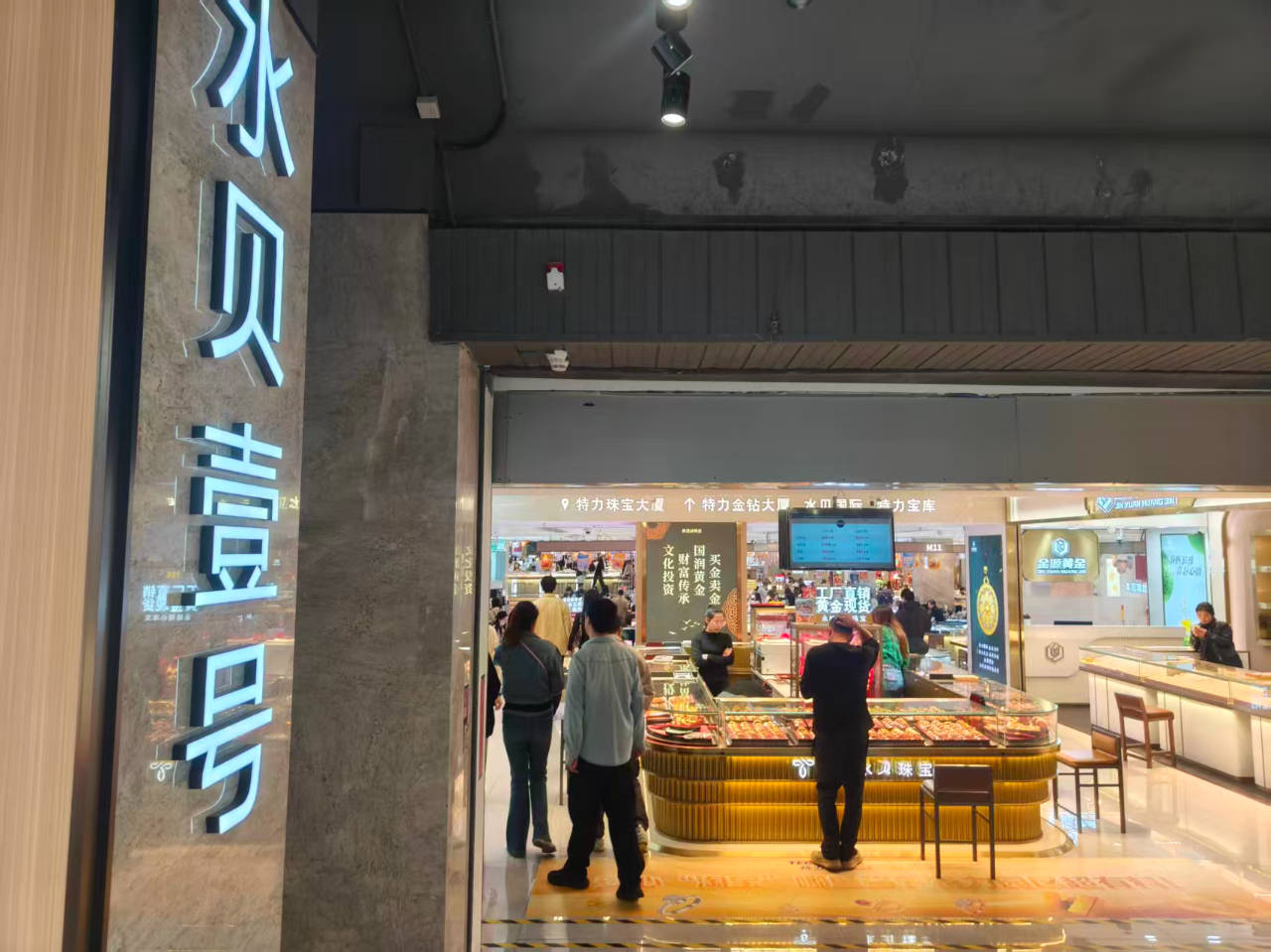 几乎在同一时间,水贝银座大厦地下一层,大多数黄金柜台也相对冷清,工作人员或在扎堆聊天,或在玩手机。记者观察了一会儿,这里人流要多一些,不过更多的是下班的人匆匆奔向地铁方向。这里周边几个大厦的地下一层连通在一起。