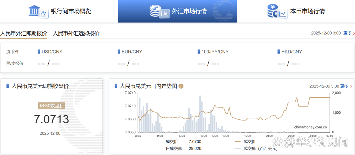 在岸人民币兑美元(CNY)北京时间03:00收报7.0730元,较上周五夜盘收盘跌10点。成交量296.26亿美元。