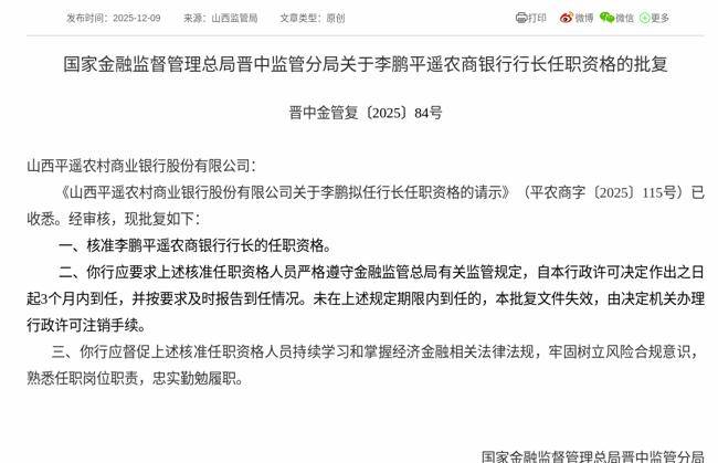 2025年12月9日,根据国家金融监督管理总局消息,《山西平遥农村商业银行股份有限公司关于李鹏拟任行长任职资格的请示》获得通过,批复李鹏山西平遥农村商业银行股份有限公司行长的任职资格。